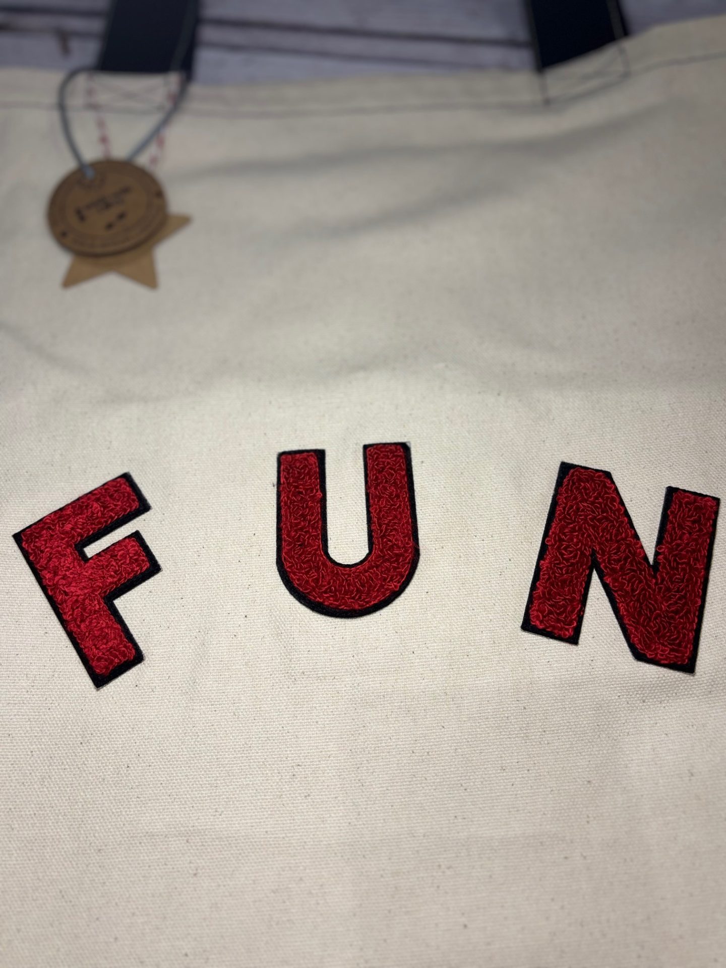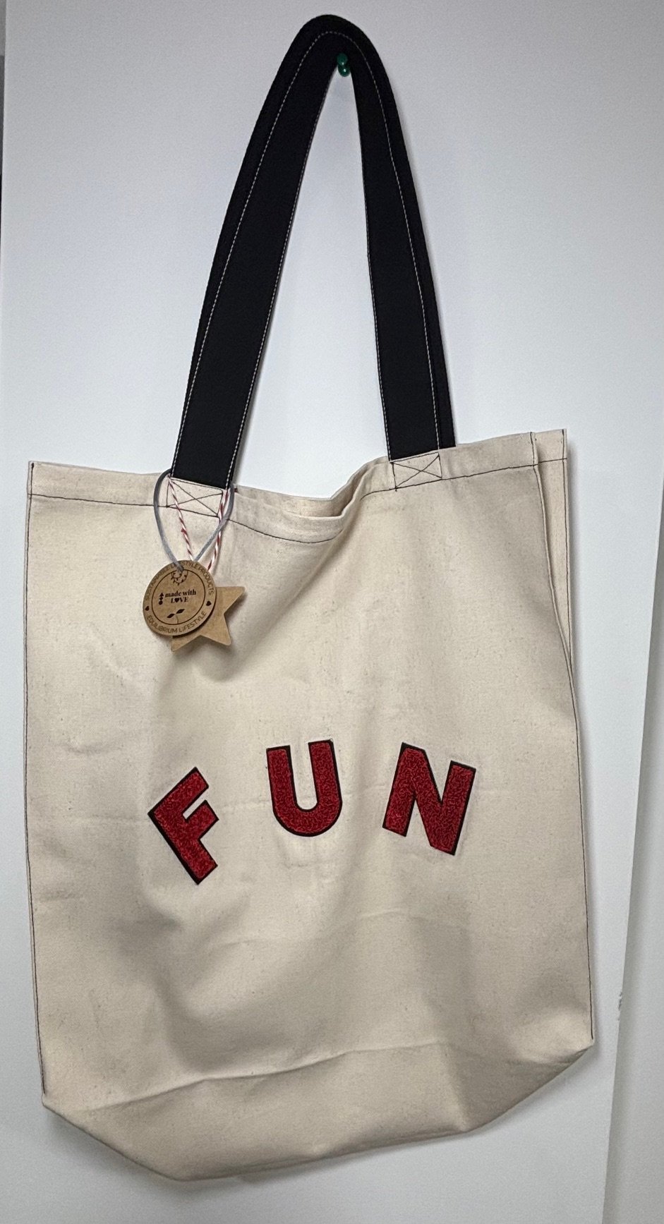 On the front, red-coloured letters spelling “FUN” add a playful, uplifting touch – a little reminder to find moments of joy in the everyday. Our totes are handmade in small batches, so while there may be similar designs, no two bags are ever completely identical.